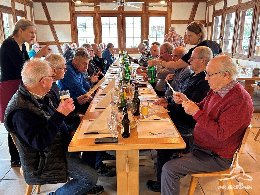 Trotz Nieselregen machten sich 28 Personen vom Bahnhof Wilchingen aus, auf die Kurzwanderung, bevor jeder aus dem reichhaltigen Menu sein Lieblingsgericht auswählen konnte. Nach dem Essen machten einige noch einen kurzen Halt im Rathauskeller. Vielen Dank Ruedi für die Organisation.